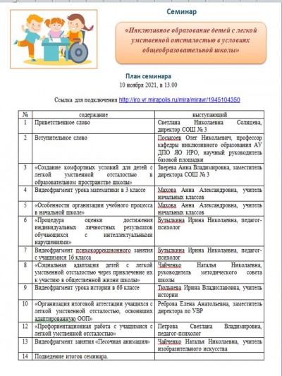 10 ноября 2021 года в СОШ № 3, в режиме ВКС прошел региональный семинар «Инклюзивное образование детей с легкой умственной отсталостью в условиях общеобразовательной школы».